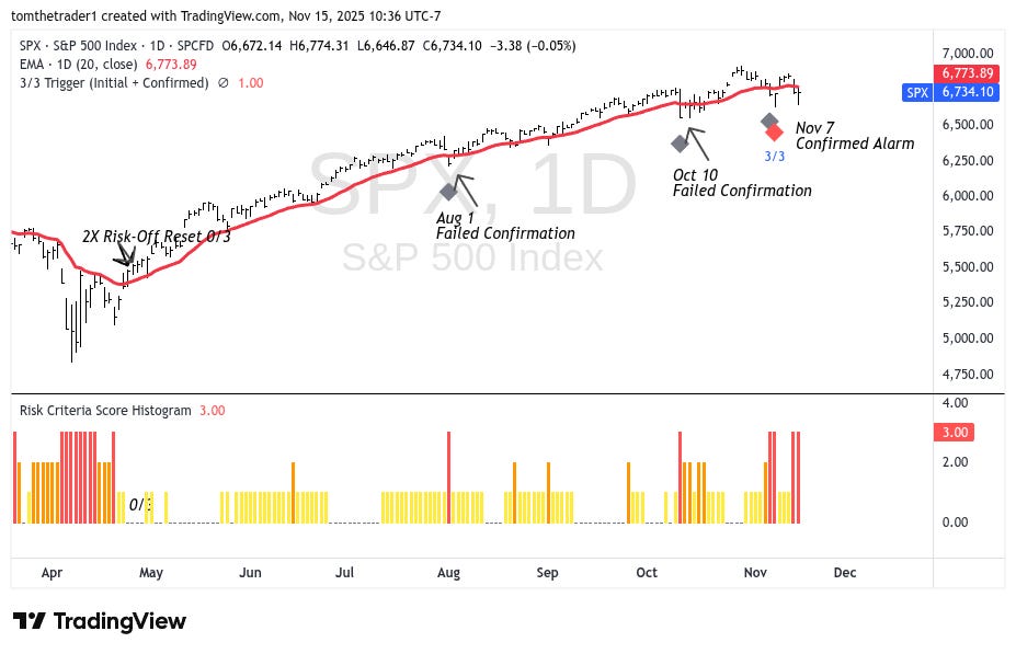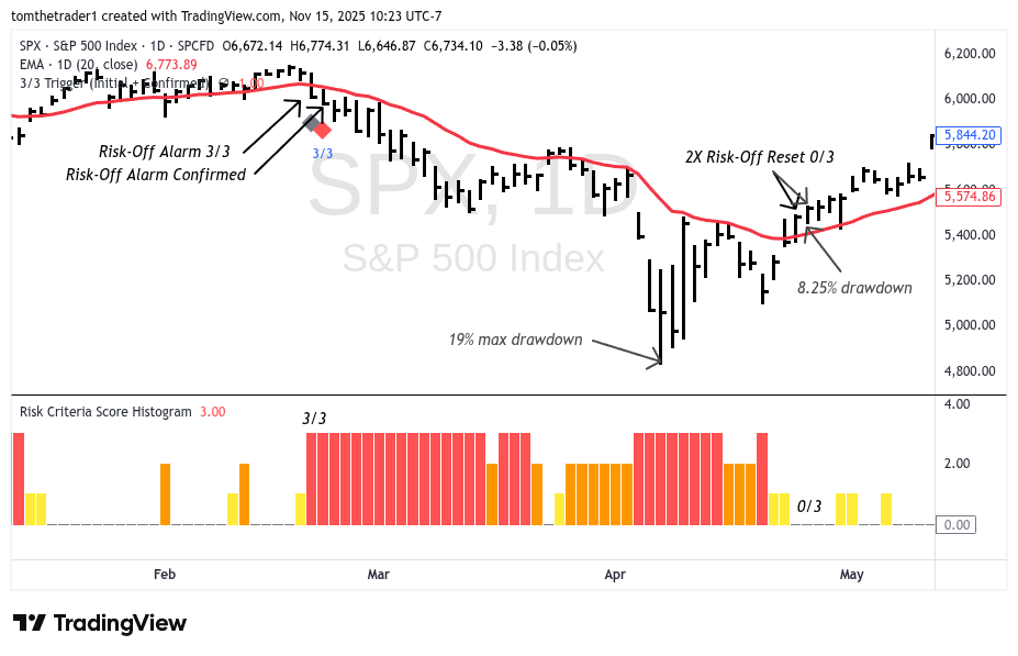 This is the scenario that transpired following the April low this year. The index rallied 22% from the risk-off alarm resetting to 0/3. There were two risk-off alarms (August 1 & October 10) that failed confirmation.