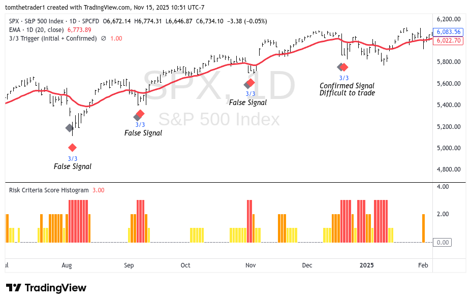 2024 is a good example of a year that challenged the system. Four confirm risk-off alarm signals set from August through December, three of which were false where no market decline was avoided. I have accepted sustaining drawdown from incorrect hedging or early profit taking on false signals in exchange for being correct in advance of the more severe declines.
