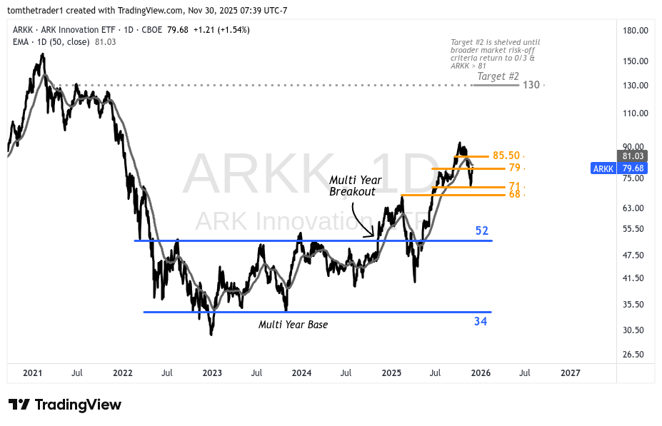 The consideration is now to establish long position in ARKK when prices close above 81. This will recapture the key trend line, and for me add confidence that the melt-up trade is the one to navigate. I remain of the speculation that there is no market melt-up without ARKK above the 50-day moving average. This was the core trade from April through October and if a melt-up is to resume, I intend to continue to use ARKK as the outperformance trade vehicle.