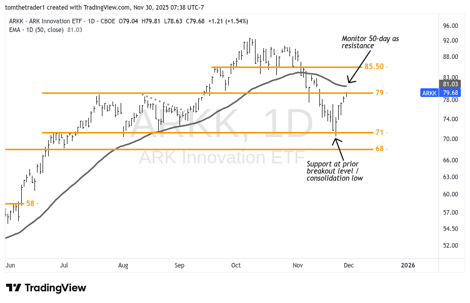 ARKK rallied along side the market through last week hitting the 79 level. The relief trade from 71 was closed last week.