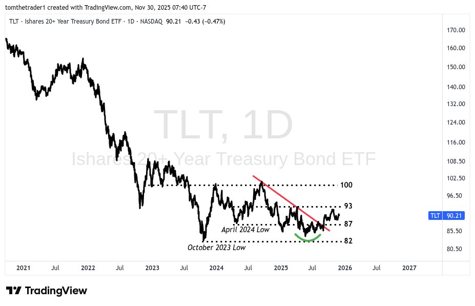 The bond trade continues to do what I had hoped for when starting to establish the position earlier in the year, and recently increasing exposure up to 25% in September. I have added the 93 level to the chart to monitor for acceleration towards 100, for now the area has instead cooled back towards ~90.