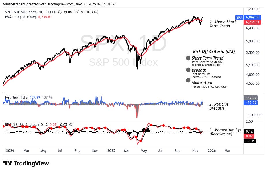 No bearish consideration until risk-off criteria trigger an alarm with the simultaneous breakdown of trend, breadth, and momentum.