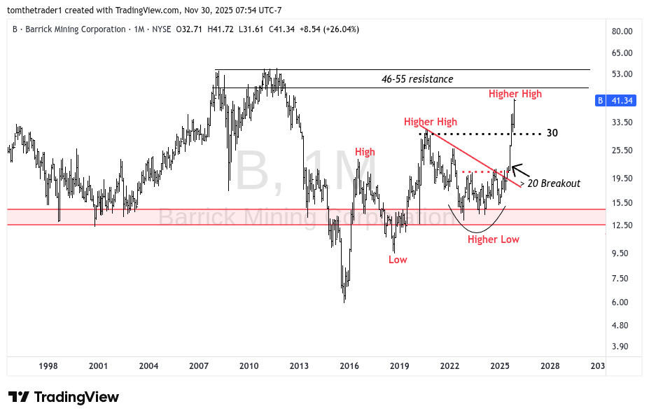 Following a strong breakout over the last three months, Barrick has formally established the next “higher high” in the monthly structure