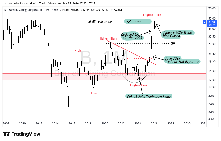 In February 2024 “the gold trade” was shared. At that time I had caught insight that Stanley Druckenmiller was selling technology, and increasing positions in two gold miners, Barrick Gold and Newmont. I found the chart appealing, and so began the nearly two year long trade. Back then, the gold commodity was trading at just above $2,000/oz, today gold trades just under $5,000/oz— the Barrick Gold stock followed the same path.