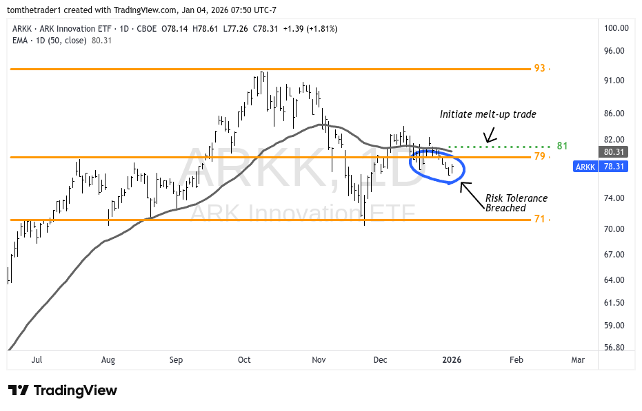 The year begins on the sidelines, with the exception of two active trades in TCEHY and GRMN carrying over from 2025 (TCHEY from 2024). The melt-up trade utilizing ARKK remains the primary trade focus to capture outperformance, establishing position here is a priority when the melt-up narrative is not on edge with the risk-off criteria in such close proximity to triggering an alarm scenario.