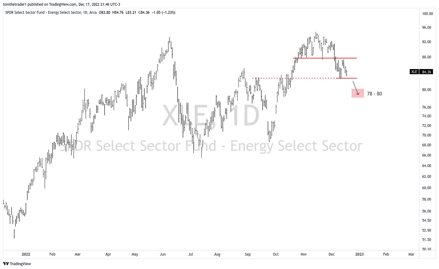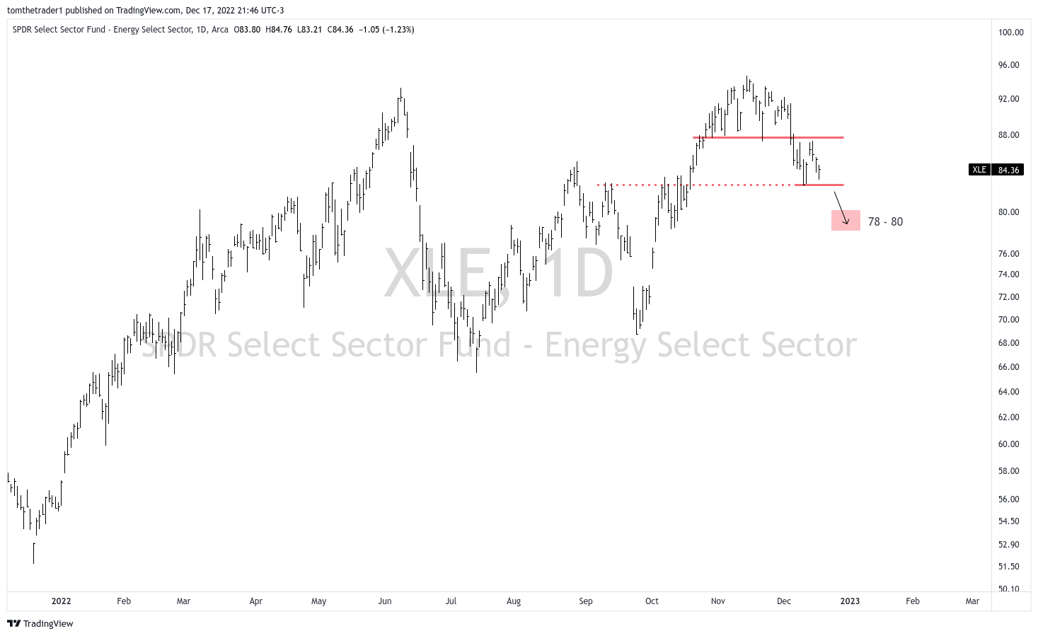 The Energy Select Sector SPDR Fund (XLE), is also approaching a critical level. If it breaks below 82, it could indicate another short-term breakdown, with a potential decline to 78.