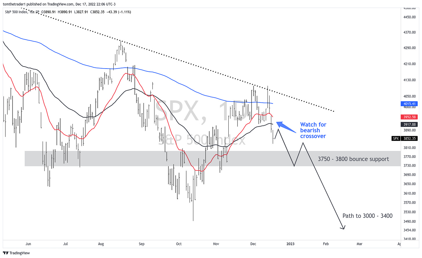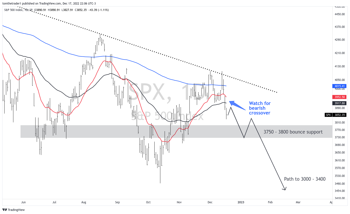 The S&P 500 closed below key moving averages, including the 20-, 50-, and 200-day exponential moving averages (red, blue, and black respectively), and may face resistance at the 3915 - 3875 level which failed to offer support. If bearish technical events, such as a negative crossover on the chart, occur before the end of the year or in early January, it could signal a move lower towards the 3000 - 3400 range. In my current thought, I am inclined to think that the market may bottom out around 3200. However, this is a tentative prediction, and there may be several pauses in the downward trend, such as between 3750 and 3800 or at the October lows of 3500.