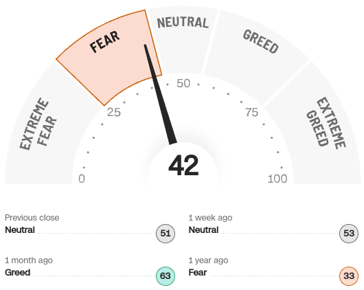 Overall, market sentiment, as measured by the CNN Fear and Greed Index, has moved into the fear category in just a few weeks, showing the rapid change in price and sentiment.