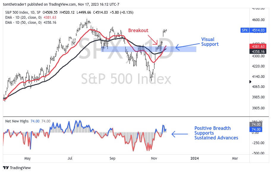 Following a breakout the previous week, the S&P 500 not only retained its strength but exhibited underlying improvements— positioning my analysis to favor a continued advance. The index closed up +2.2% for the week, and most notably breadth is finally supporting the advance. Positive breadth has underpinned the best market rallies over the last two years.