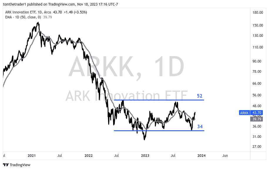 I am speculating outperformance from the '2020 era high-growth names.' Many of these companies that are left have spent the last year and a half consolidating from severe declines. This category is well represented by Cathie Wood’s ARK Innovation ETF (ARKK). ARKK has progressed through a period of wide consolidation with substantial range (34 to 52) for a period of a year and a half.