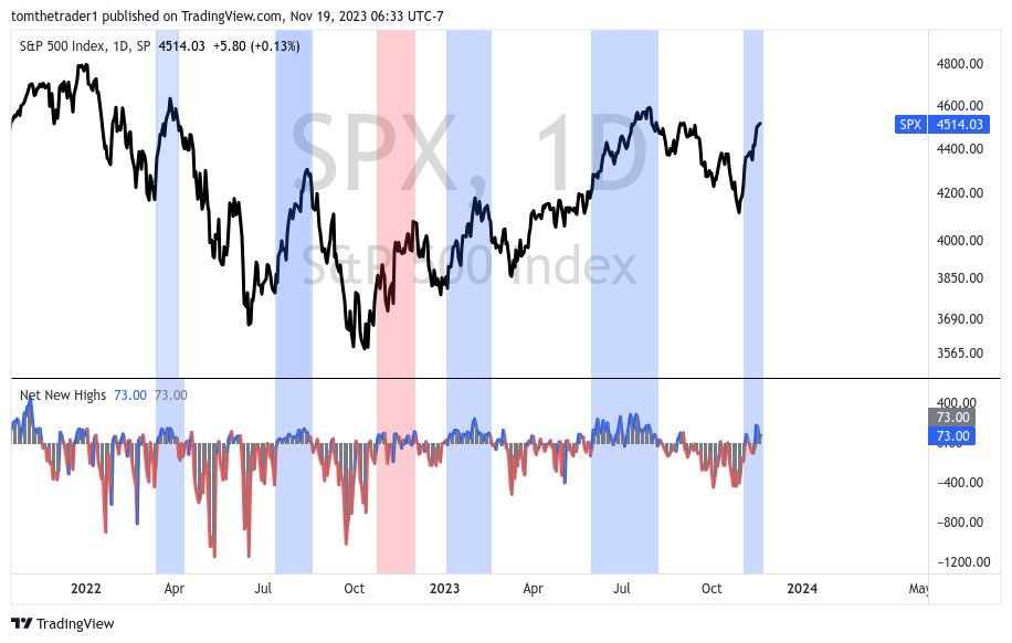 The updated chart of the S&P 500 below, carried over from last week, identifies six instances where breadth (Net New Highs) stayed positive. Blue shading highlights segments of market advances that were supported by successive positive breadth, while the rally shaded in red, despite mostly positive breadth, is less obvious when compared to other market rallies. The best rallies over the last two years have been supported by positive breadth.