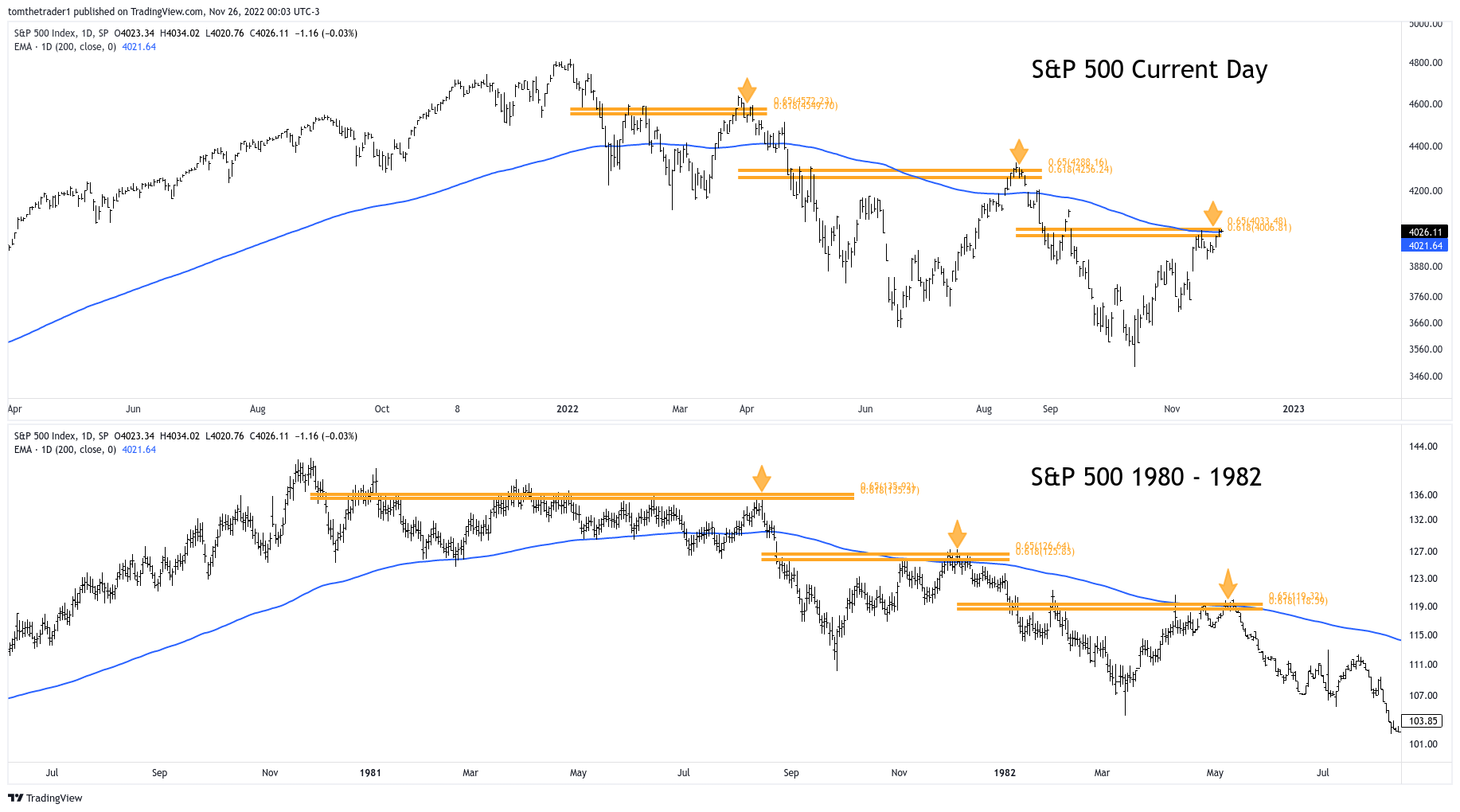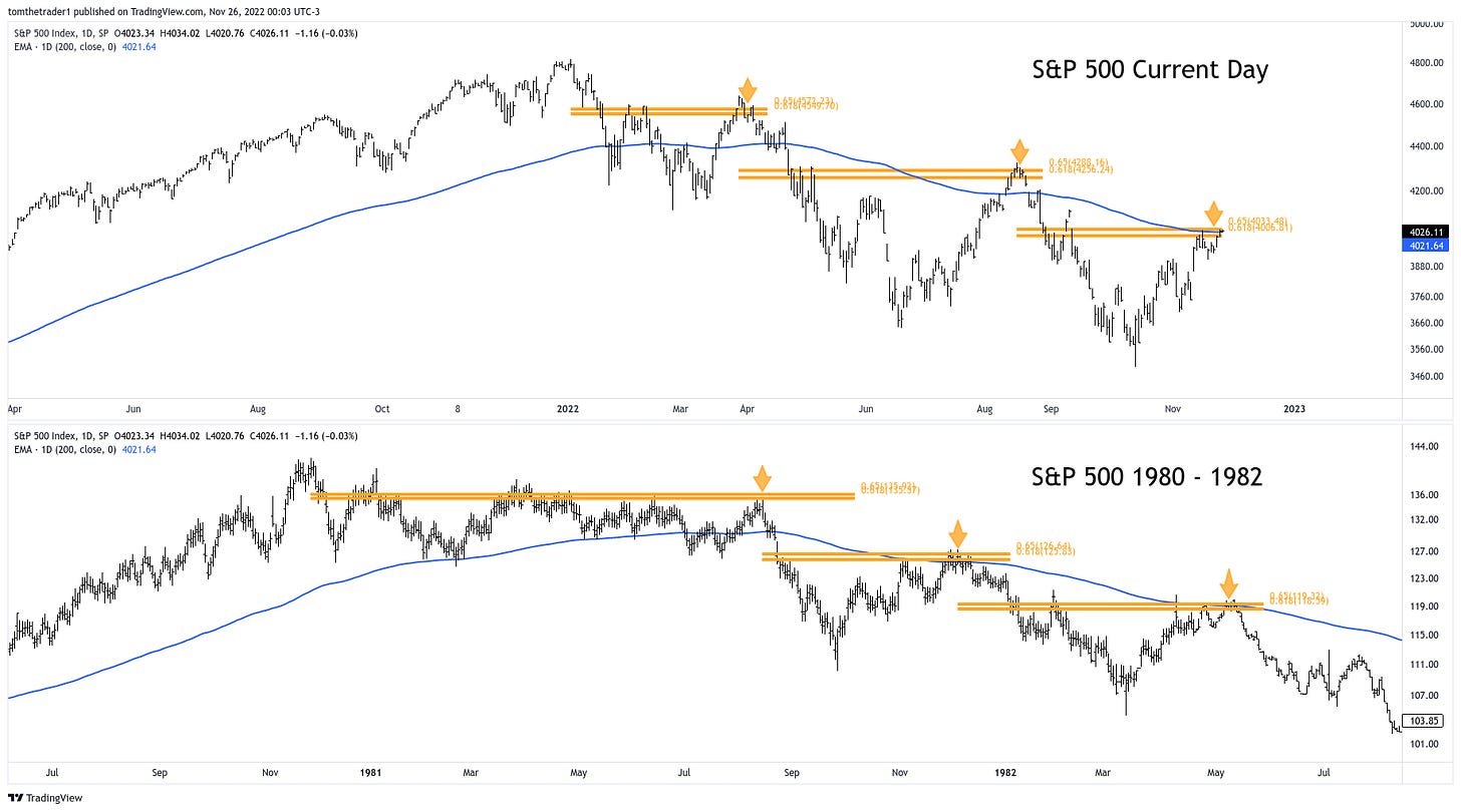 The bear market rallies throughout the 1980-1982 decline share a remarkable similarity when compared against the current day decline. Three clear rejections— all at the golden pocket and the long duration moving average (blue line).